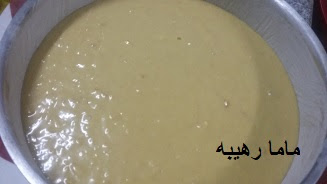 يصب في الصينيه المبطنه بالسمن والدقيق